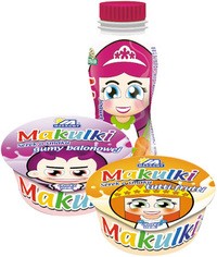 Także wśród oferty jogurtów dla dzieci znajdziemy jogurty pitne. Tutaj świetnym przykładem promocji skierowanej do dzieci jest pomysł Grupy Polmlek – jogurt pitny Makulki o smaku marchwiowo-owocowym, w wersjach z bananem, jabłkiem i malinami. Atrakcyjność produktu uwypukla ciekawa szata graficzna poręcznych buteleczek 250 ml z wizerunkami postaci Mali, Drakulka i Indi.