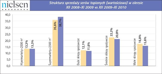 Zasysanie sprzedaży kategorii przez kanał nowoczesny, a zwłaszcza sklepy dyskontowe (gdzie oferowane są produkty firm: Hochland Polska, Danone, Grupa Polmlek, Piątnica (OSM), Mlekovita (GK) czy Unilever Polska) obnaża niedoceniany fakt. Polacy niezależnie od stopnia zamożności chętnie zaglądają do sklepów sieci Lidl i Biedronka i byłoby naiwnością twierdzić, o czym mówiło się wcześniej, że zaglądają tam wyłącznie osoby o ograniczonej zasobności portfela. A zatłoczone wnętrza i długie kolejki do kas w dyskontach w każdym mieście w Polsce mówią same za siebie.