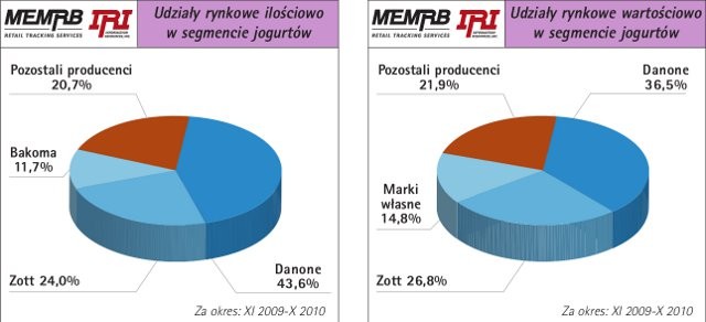 Segment jogurtów łyżeczkowych, do których zalicza się jogurty z kawałkami owoców, wzrósł o 13,6%, a segment jogurtów łyżeczkowych z owocami (co stanowi uszczegółowienie wcześniejszych danych) wzrósł o 4%. Warto zwrócić uwagę, że jogurty z owocami są w tej grupie zdecydowanym liderem (66% w grupie jogurtów łyżeczkowych). Segment ten nieco osłabł (relatywnie) w porównaniu do innych mniejszych segmentów, które rosły szybciej (zwłaszcza jogurty typu bałkańskiego). Niemniej karty wciąż na rynku rozdają: Zott, Danone i Bakoma. Co ciekawe pozostali gracze nadal zajmują 43%, co oznacza, że dominacja tych trzech firm wciąż nie jest procesem zakończonym i mogą one za pomocą sprawdzonego marketingu zwiększać udziały rynkowe. Mimo to widać, że inni uczestnicy rynku już odbijają się od dna, a takie marki jak Milko, Polskie nie są skazane na bycie statystami obok wielkich i bogatych koncernów.