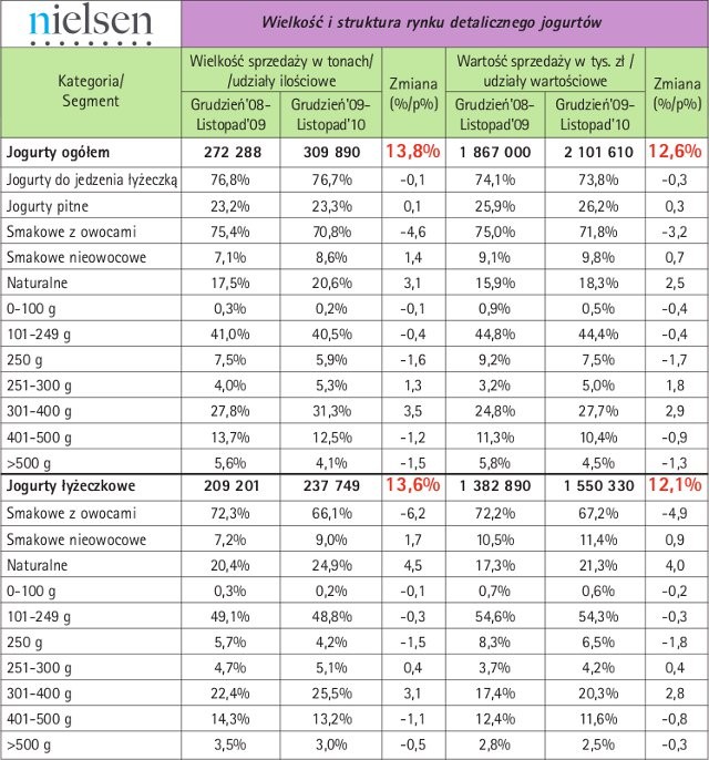 Polacy mają słabość do jogurtów, a dane agencji Nielsen dla tej ogromnej kategorii można uznać wręcz za entuzjastyczne. W badanym okresie (XII 2009-XI 2010) nastąpiła eksplozja popytu zarówno po stronie wolumenu (wzrost o 13,8%) jak i wartości (wzrost o 12,6%). Waga kategorii i skala wzrostu pokazują potencjał kategorii jogurtów. Dla handlowców to sygnał, że jeszcze bardzo wiele w tej kategorii może się wydarzyć. Co warte zauważenia obie kategorie: jogurty łyżeczkowe i pitne są tak samo silne.