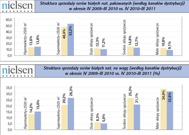 Dane za okres IV 2010-III 2011 pokazują niezwykłą siłę popytu na serki wiejskie. To jedna z najmocniejszych kategorii w grupie twarogów w ostatnim roku. Same serki wiejskie wygenerowały wzrost o 27%.