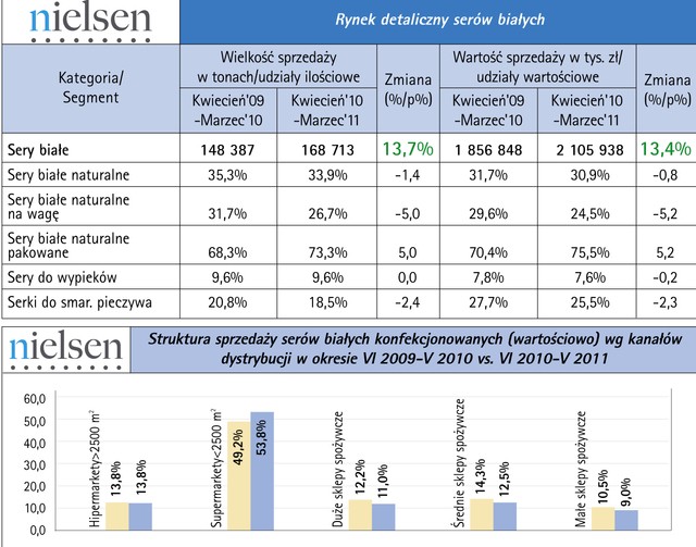 Każdego roku kategoria twarogów podlega wyraźnemu przeobrażeniu. Co roku kilka procent wszystkich twarogów więcej stanowią produkty pakowane, a nie wagowe. W wymiarze wolumenowym przyrost jest dużo większy, bo rynek twarogowy rośnie o kilkanaście procent rocznie. W okresie IV 2010-III 2011 już 73%, ze 165 tys. ton twarogów, było starannie pakowanych w mleczarniach (dane Nielsen). Nie ma wątpliwości, że proces postępował.
