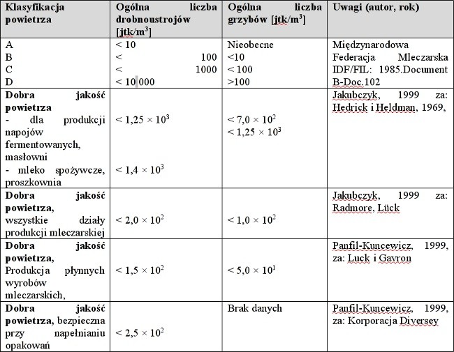 W dyrektywach europejskich nie określono wymagań jakości mikrobiologicznej powietrza w zakładach przemysłu spożywczego. Dla zakładów mleczarskich można korzystać z propozycji Międzynarodowej Federacji Mleczarskiej bądź zaleceń różnych autorów (Jakubczyk, 1999, Panfil-Kuncewicz, 1999). Zestawienie wybranych propozycji przedstawiono w tabeli 2.
