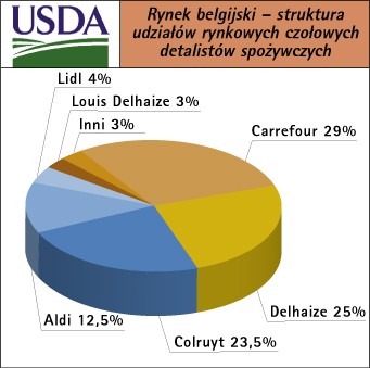 Według USDA Foreign Agriculture Service w Belgii lokalne supermarkety takie jak Colruyt i AD Delhaize, stanowią blisko 50% rynku. Udział supermarketów i tzw. wygodych sklepów w Belgii wynosi około 25%. Według danych USDA w Belgii 3 wiodących detalistów ma blisko 77,5% rynku.