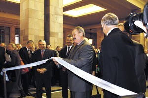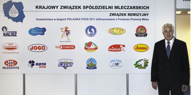 Targi Polagra Food 2011. Waldemar Broś, Prezes Zarządu KZSM ZR na tle logotypów spółdzielni i zakładów mleczarskich korzystających z dofinansowania uczestnictwa w imprezie targowej