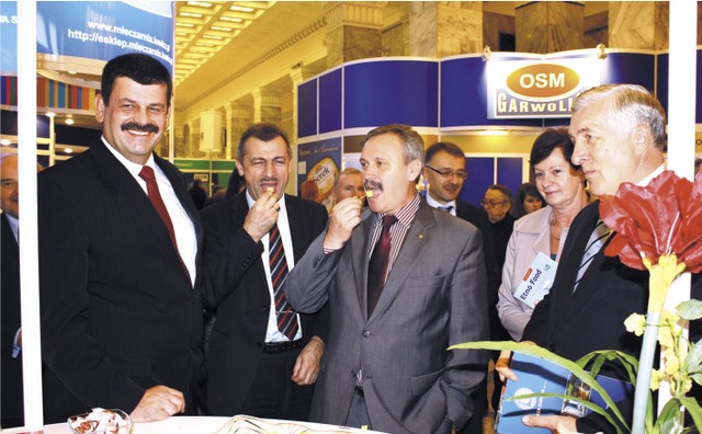 20. Jubileuszowe Targi Mleko-Expo 2011. Tadeusz Nalewajk, Podsekretarz Stanu w MRiRW wraz z Waldemarem Brosiem, Prezesem Zarządu KZSM ZR na stoisku mleczarni Sierpc (OSM). Gości podejmuje Grzegorz Gańko, Prezes Zarządu mleczarni Sierpc (OSM)