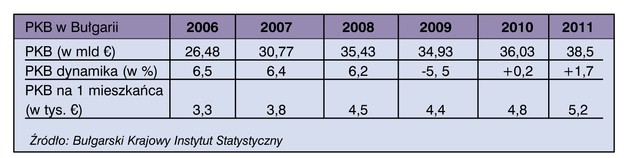 Według wstępnych danych Krajowego Instytutu Statystycznego w Bułgarii (NIS) w 2011 r. nominalny Produkt Krajowy Brutto wyniósł 38 482,6 mln euro. PKB na jednego mieszkańca w tym okresie był na poziomie 5168,7 euro. W 2011r. w porównaniu z rokiem ubiegłym nastąpił wzrost o 1,7%.