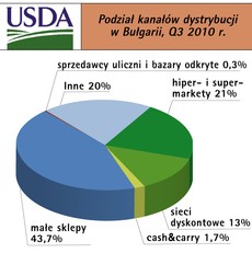 Według danych uzyskany z danych żródłowych WPHiI w Bułgarii największy udział w dystrybucji mają małe sklepy (43,7%), następnie hiper- i supermarkety (21%) oraz sieci dyskontowe. Format cash&carry zajmuje zaledwie 1,7%.
