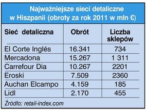 Do Grupy Carrefour działającej na rynku hiszpańskim należą następujące supermarkety: Carrefour, Carrefour Market oraz DIA. W maju 2011 r. Grupa Carrefour posiadała 170 hipermarketów Carrefour oraz 110 sklepów Carrefour Market. Marką Grupy Carrefour działającą w sektorze hard discount jest DIA. Cechą charakterystyczną supermarketów DIA jest minimalistyczny wystrój sklepów, bardzo ograniczony asortyment oraz niskie koszty operacyjne. Sieć DIA skupia się głównie na rozwoju swojej marki własnej – Dia, która oferuje towary od wybranych producentów, zapewniając najlepszą relację – jakości do ceny. W 2010 roku Grupa Carrefour zmniejszyła swój udział w rynku osiągając wynik 18,3%. Obecnie spółka zajmuje się modernizacją hipermarketów poprzez zastosowanie nowego formatu – Planet. Każdy z tych nowych sklepów to koszt ok. 4 mln euro. Według szacunków do 2012 r. spółka zainwestuje 500 mln euro.