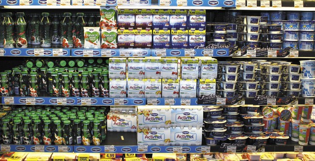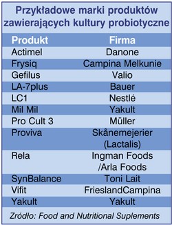 Firma Danone na rynku jest obecna z probiotycznym jogurtem marki Actimel – zawierającym żywe kultury szczepu L. casei Imunitass. Produkty probiotyczne Nestlé głównie bazują na szczepie Lactobacillus 1, a bakterie obecne były m.in. w probiotycznym jogurcie pod marką LC1. Firma Müller Dairy proponuje markę Vitality – mleczne napoje i jogurty zawierające 2 szczepy bakterii probiotycznych Lactobacillus-5 and Bb-12. Müller używa także inuliny i prebiotyków.