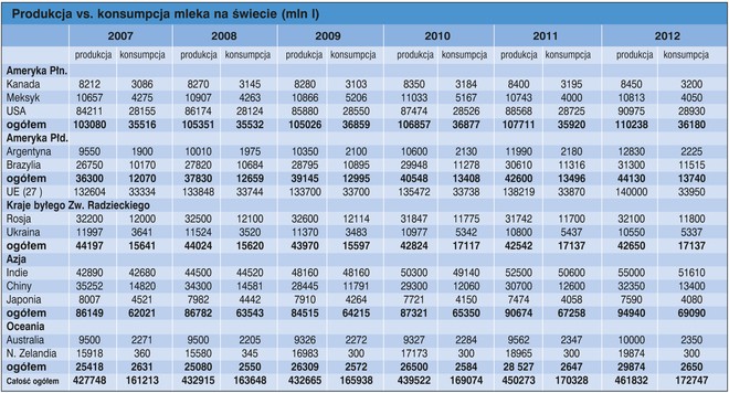 Według prognoz NYSEARCA: FAS z czerwca 2012 r. wśród największych producentów mleka są Europa (dotyczy EU-27), Stany Zjednoczone oraz Azja Południowa. Wśród największych konsumentów mleka zdecydowanymi faworytami są Azja Południowa, Stany Zjednoczone oraz Europa.