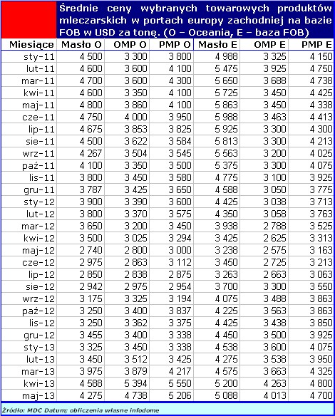 Tabela 4. Średnie ceny wybranych towarowych produktów mleczarskich w portach europy zachodniej na bazie FOB w USD za tonę. (O – Oceania, E – baza FOB)
