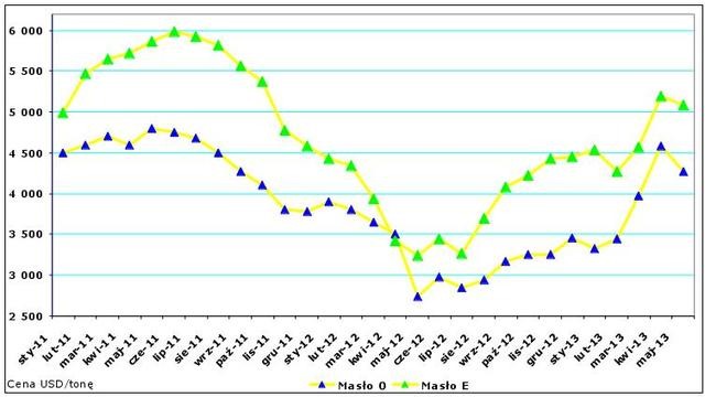 Wykres 1. Cena masła w USD/tone w portach europy zachodniej na bazie FOB w USD za tonę. (O – Oceania, E – baza FOB)