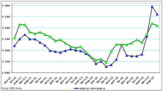 Cena OMP (wykres nr 2) w maju br. wyniosła 4.738 USD/tone (baza FOB Europa zachodnia) i była wyższa w porównaniu rocznym o ok. 69%. W tym samym czasie cena OMP w Oceanii wyniosła 4.013 USD/tone.