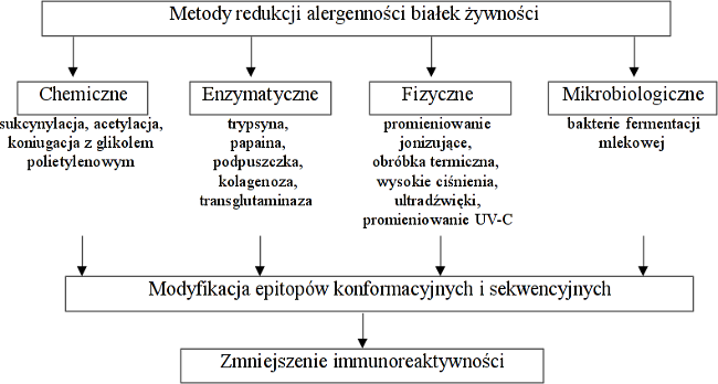 W szczególnych przypadkach środki kontroli nad alergenami pokarmowymi mogą obejmować działania redukujące lub nawet eliminujące niektóre alergeny, zwłaszcza białka natywne, kiedy to składniki alergenne są poddawane odpowiednim modyfikacjom. Istota środków kontroli stosowanych w celu zmniejszenia immunoreaktywności alergenów pokarmowych polega na dokonaniu zmian w strukturze trzecio- i drugorzędowej antygenu pod wpływem czynników fizycznych, biochemicznych i biologicznych (rys. 1).