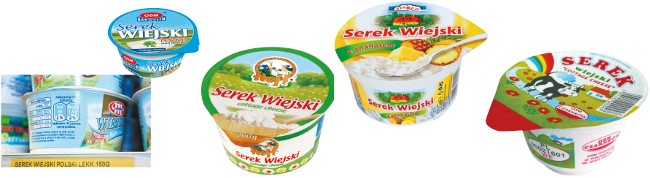 Krok dalej „poszedł” Polski serek wiejski z Mlekovity. Realizacja zupełnie tu odbiega od pierwowzoru. Inna jest też czcionka i jej kolor, czerwień zastąpił granat z bielą i to zasadniczo wyróżnia opakowanie serka spośród bliźniaczo opisanych czerwonymi puszystymi literami.