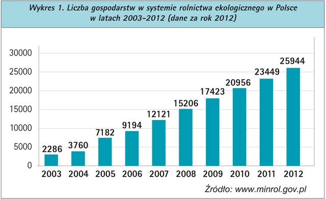 Tradycja rolnictwa ekologicznego w Polsce liczy sobie zaledwie 23 lata. Pierwsze gospodarstwa, którym przyznano wstępne atesty powstały w 1990 roku. Trzy lata później takich gospodarstw było już około 180, a w 1997 r. działało ich 207. O dynamice rozwoju tego sektora świadczyć może wykres 1, w którym przedstawiamy wzrost liczby gospodarstw ekologicznych do roku 2012 roku.