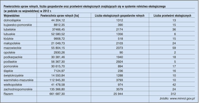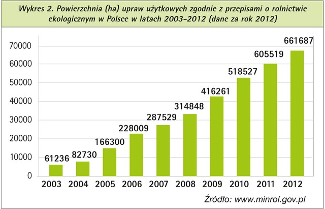Również powierzchnia przeznaczona na rolnictwo ekologiczne odnotowuje regularny wzrost. Obecnie w Polsce jest to już powierzchnia 661687 ha i na tym terenie działo blisko 26 tys. gospodarstw. W roku 2012 najwięcej terenów pod uprawy ekologiczne znajdowało się w województwach zachodniopomorskim, warmińsko-mazurskim oraz podlaskim. Procentowy udział powierzchni ekologicznej w Polce wynosi 3,2% i jest to 10% wzrost w odniesieniu do 2011 roku. Średnia powierzchnia gospodarstw ekologicznych wynosi w naszym kraju 26 ha, przy średniej krajowej ok. 10 ha dla gospodarstw konwencjonalnych.