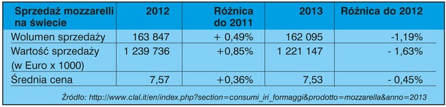 Rok 2013 nie był dobry dla sera mozzarella we Włoszech. Odnotowano spadki zarówno w ujęciu ilościowym jak i wartościowym. W 2013 roku sprzedano we Włoszech 162 095 ton mozzarelli o wartości 1221 147 tys. euro, co w stosunku do poprzedniego roku w układzie ilościowym wyniosło o 1,2% mniej, a w ujęciu wartościowym o -1,6%. Najwięcej mozzarelli sprzedano w miesiącach czerwiec-wrzesień, a najmniej w styczniu i lutym.