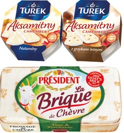 Kluczową pozycję i pierwsze miejsce na rynku oraz szeroki asortyment znajdziemy w porfolio marki Turek. W minionym roku Mleczarnia Turek dokonała szerszego liftingu wizualnego swojej marki na bardziej nowoczesny. W linii camembert znajdziemy produkty z ziołami, pieprzem, grzybami leśnymi, papryką i czosnkiem, w wersji owocowej będą to odpowiednio żurawina i morela. Sery są o gramaturach 100 g, 120 g i 150 g.