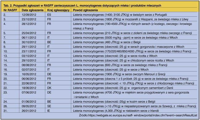 Jednak, jeżeli producent może wykazać w sposób zadowalający dla właściwego organu, że produkt nie przekroczy limitu 100 jtk/g w ciągu całego okresu przydatności do spożycia, to kryterium nie ma zastosowania. Przekroczenia w 2012 r. w produktach mlecznych zaprezentowano w tab. 2. W 2012 roku do systemu RASFF zgłoszono 31 przypadków zanieczyszczonych produktów mlecznych. W tabeli zaprezentowano tylko 20 dotyczących L.monocytogenes.