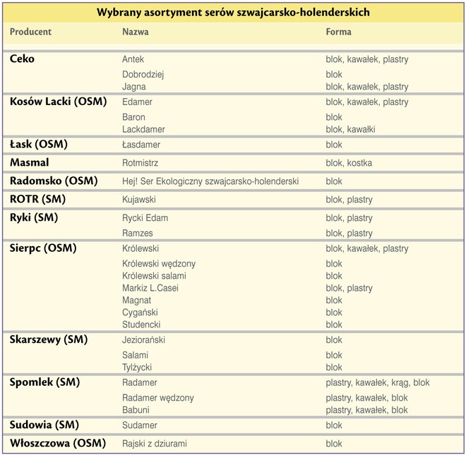 Do najmocniejszych ofert na krajowym rynku należą oferty Grupy Mlekovita, Hochland Polska, Ryki (SM), Sierpc OSM, Spomlek (SM), Grupy Polmlek. Jednym z najsilniejszych producentów serów typu szwajcarsko-holenderskiego w Polsce jest mleczarnia Sierpc (OSM). Sztandarowym produktem cieszącym się zasłużonym powodzeniem jest ser Królewski, dostępny zarówno w bloku jak i w nowych plastrach, które umieszczono w najciekawszym koncepcyjnie opakowaniu typu otwórz/zamknij od czasu wdrożenia tych ostatnich na polskim rynku.