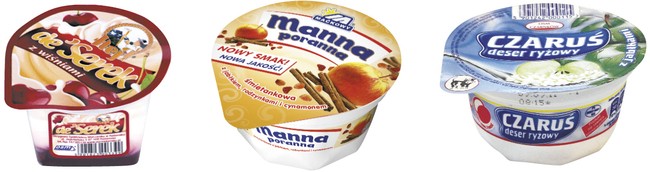 Kolejna odsłona mlecznych deserów to desery z kaszką lub ryżem. W tym przypadku deser, obok roli „uprzyjemniacza”, zdecydowanie pełni jednocześnie funkcję posiłku. Tego typu specjały oferuje konsumentom: pod marką Czaruś mleczarnia Czarnków (OSM) ,a pod markami Serduszko, Smakija i Belriso firma Zott. Znajdziemy tu także Mannę Poranną Grupy Polmlek/Maćkowy (ZM).