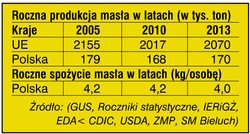 Produkcja masła w UE-27 utrzymuje się na podobnym poziomie (około 2337 tys. ton w minionym roku) i wykazuje od roku 2010 tendencję wzrostową. Zauważa się też systematyczny wzrost konsumpcji masła w UE. W 2013 roku było to na poziomie 2127 tys. ton.