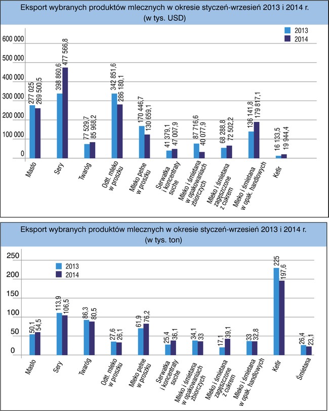 Białoruski eksport produktów mlecznych w pierwszych dziewięciu miesiącach 2014 r., według danych Ministerstwa Rolnictwa RB, kształtował się w wymiarze ilościowym na poziomie 2,5 mln ton, co stanowiło o 7,4% mniej niż w okresie styczeń-wrzesień 2013 roku. W ujęciu wartościowym eksport produktów mlecznych wzrósł o 0,4% i wynosił 1735,6 mln USD. W pierwszych dziewięciu miesiącach 2014 r., największy udział w eksporcie miała produkcja wyrobów pełnomocnych, zarówno w wymiarze ilościowym, jak i pod względem wartości. We wskazanej grupie asortymentowej odnotowano także największy wzrost cen w porównaniu z okresem od stycznia do września 2013 roku.