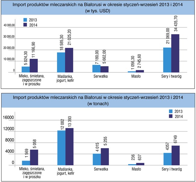 Według Ministerstwa Rolnictwa RB, import produktów mlecznych w okresie od stycznia do września 2014 r. kształtował się w wymiarze ilościowym na poziomie 121,2 tys. ton, co stanowi 2,3 razy więcej niż w pierwszych dziewięciu miesiącach 2013 roku. W ujęciu wartościowym import wzrósł o 87,4% do 95,7 mln USD. Wzrost importu odnotowano we wszystkich typach produktów mlecznych.