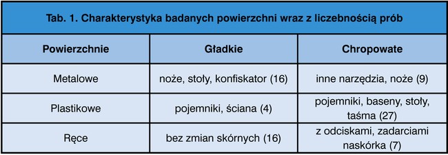 Badania przeprowadzono w zakładzie przemysłu spożywczego. Zbadano 79 powierzchni w zakładzie przemysłu spożywczego. W tab.1. zestawiono badane powierzchnie wraz z liczbą przeprowadzonych wymazów. Nie ustalono stałych punktów pomiarowych, żeby uniemożliwić pracownikom wykonującym czynności mycia i dezynfekcji przygotowanie się do badań.