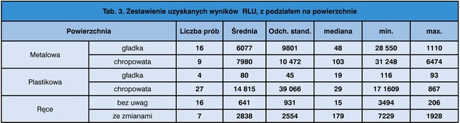 Oznaczenie ATP przeprowadzono jednocześnie do poboru prób do badań mikrobiologicznych. Do oznaczenia ilości RLU wykorzystano luminometr firmy Charm oraz testy jednorazowe PocketSwab ATP w postaci tzw. penów z wymazówkami – gotowe do użycia – firmy Charm. Korzystając z gotowych, specjalnych wymazówek pobrano próby z badanych powierzchni. Następnie wkręcając wymazówkę w jej skuwkę przebijano się przez specjalną błonkę w wymazówce, wstrząsano przez określony czas (podany w instrukcji obsługi używanego luminometru), a następnie wkładano do czytnika w luminometrze. Na ekranie następował odczyt we względnych jednostkach świetlnych (jako że w czasie wstrząsania zachodzi reakcja pomiędzy ATP a lucyferazą – związkiem tworzącym świetlne widmo) czyli RLU. Całość badania od momentu pobrania do uzyskania wyniku trwała maksymalnie 5 minut. Uzyskane wyniki przedstawiono w tabeli nr 3.