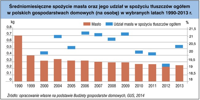 Zaobserwowano, że im większe wykształcenie posiada osoba prowadząca gospodarstwo domowe, tym więcej spożywa się tam masła. W gospodarstwach domowych, w których głową rodziny była osoba z najniższym wykształceniem średniomiesięczne spożycie masła wyniosło około 0,6 kg na osobę, podczas gdy w gospodarstwach domowych prowadzonych przez osoby legitymujące się wyższym wykształceniem – ponad 0,9 kg na osobę.