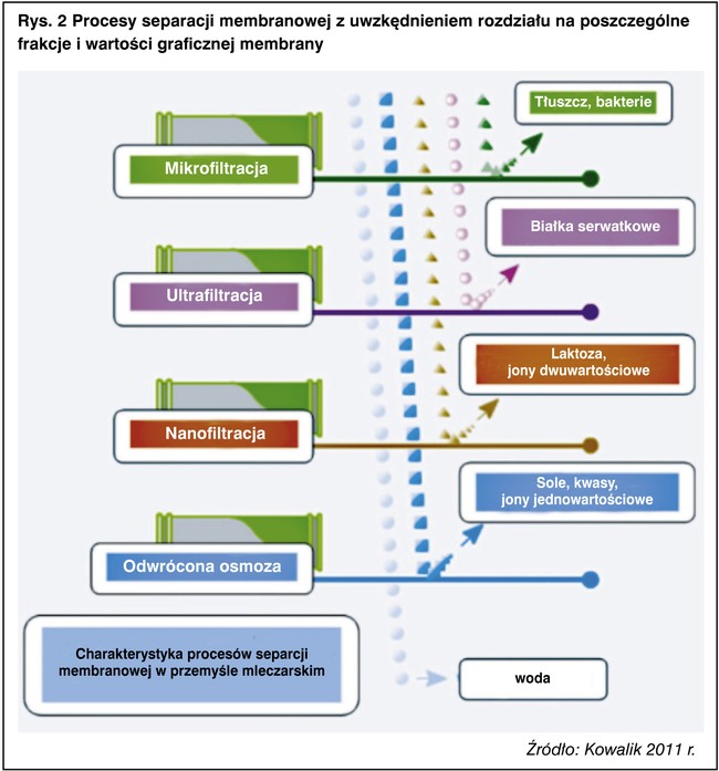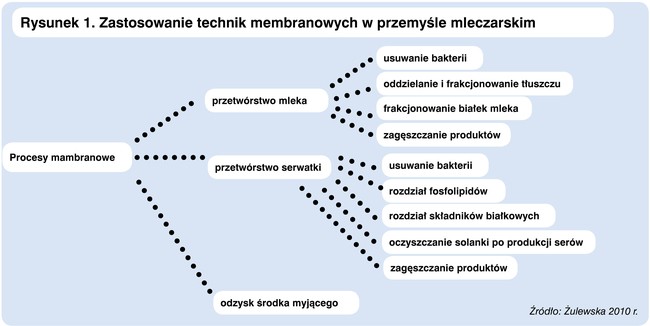 Do każdego w zastosowań pokazanych na rysunku 1 należy dobrać odpowiedni typ, rodzaj i przepuszczalność membrany by uzyskać zamierzony efekt. Szczegółowo o zastosowaniu membran w produkcji mleczarskiej pisał dr J. Kowalik w Forum Mleczarskim Biznes w 2011 r. – nr 3/2011 (11) dlatego poza najważniejszymi informacjami pomagającymi w omówieniu zagadnień higienizacji szczegółowo nie będą przybliżane.
