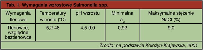 Bakterie z rodzaju Salmonella rosną dobrze na podłożach standardowych. Szybki wzrost następuje w warunkach tlenowych, możliwy jest też we względnie beztlenowych. Optimum temperaturowe wzrostu to 35-37°C. Wymagania wzrostowe pokazano w tab. 1.