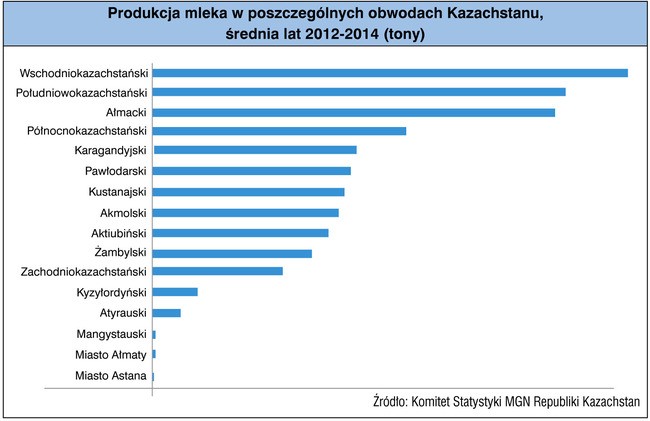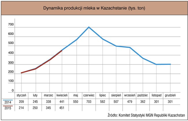Produkcja mleka w obszarach wiejskich Kazachstanu odczuwała wyraźne wahania. Na przedstawionym schemacie wskazano produkcję w okresie od stycznia 2014 r. do kwietnia 2015 r. Należy zauważyć, że wzrost produkcji mleka na wiosnę i latem obserwowany jest rokrocznie, a szczyt jego produkcji przypada na czerwiec – do 700 tys. ton. Najniższy poziom produkcji mleka notowany jest w styczniu – do 209 tys. ton. Całościowa analiza statystyczna wykazuje, że w 2015 r. w porównaniu do 2014 r. wzrost produkcji mleka przypada na każdy miesiąc w roku. Głównym powodem wahań cyklu produkcyjnego jest bardzo słabe wykorzystanie technologii przemysłowych oraz wysoka koncentracja zwierząt w gospodarstwach indywidualnych.
