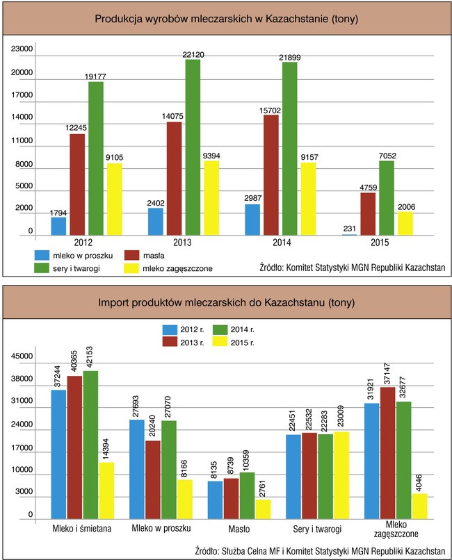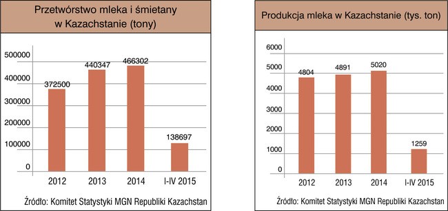 Według danych Komitetu Statystyki Ministerstwa Gospodarki Narodowej Republiki Kazachstanu w 2014 r. przetworzono 466 302 tony mleka i śmietany. W porównaniu do 2012 r. zanotowano wzrost przetwórstwa w wymiarze liczbowym o 93 802 tony, czyli o 25%. Należy zauważyć, że w ostatnich latach obserwuje się wzrost liczby małych zakładów przetwórstwa mleka metodami przemysłowymi, a także liczne inwestycje i modernizacje w dużych zakładach przetwórczych.