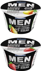 Z kolei Bakoma, oferująca jogurty Men w butelce i kubeczku zwraca uwagę, że białko odgrywa ważną rolę w diecie mężczyzny. Skierowany do mężczyzn produkt ma poprzez zawarte w nim białko pomagać w utrzymaniu odpowiedniej masy mięśniowej, jak również zapobiegać nadmiernemu przybieraniu na wadze. Bakoma punktuje: białka pełnią podstawowe funkcje budulcowe w naszym organizmie, są podstawową strukturą wszystkich żywych komórek. Białka z jogurtów Men są niezbędne w codziennej diecie, a aminokwasy, których dostarczają, pozwalają na bieżąco odbudowywać proteiny organizmu. Produkt dostępny jest o smakach truskawkowym, gruszkowym i morelowym (kubeczek) oraz owoców leśnych (butelka).