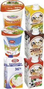Na wprowadzenie do oferty wariantu litrowego w kartonach zdecydowało się stosunkowo wielu producentów – Mlekpol (SM) (zawartość tłuszczu 36%), Lactalis Polska (31%); Łowicz OSM (30 i 36%); Sudowia (SM) (18 i 32%); Wart-Milk (OSM) (36%); ROTR (SM) (30%); Grupa Mlekovita, w której na uwagę zasługuje szeroki wybór różnych zawartości tłuszczu śmietanek oferowanych w litrowych opakowaniach (18%, 30%, 34% i 36%). W „king size” – 5 lub 10 l w kartonach – celuje już mniej wytwórców. Wśród nich można znaleźć mleczarnię Sudowia (SM) (w opakowaniach 5 l dostępne są aż trzy warianty: 18%, 32%, 36%), Grupa Mlekovita (5 l i 10 l, 30% i 33%) i ROTR (SM) (5 l, 33%). Z kolei wariant makro w wiaderkach dostępny jest w ofercie Grupy Polmlek (5 l i 10 l, 30%) lub Wieluń (SDM) (10 l, 30%; 36%).