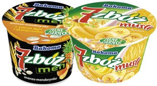 Bakoma pomyślała też o mężczyznach i dla nich specjalnie opracowała męsko wystylizowaną linię śniadaniową 7 zbóż men w 300 g pojemniczkach (brzoskwinia i gruszka, jabłko i pomarańcza, ananas i mandarynka, jagoda i porzeczka, figi, rodzynki i winogrona oraz żurawina z czerwonym grejpfrutem – z dodatkiem ziaren dyni i słonecznika) oraz 150 g pojemniczki w wersjach brzoskwinia i gruszka oraz ananas i mandarynka.