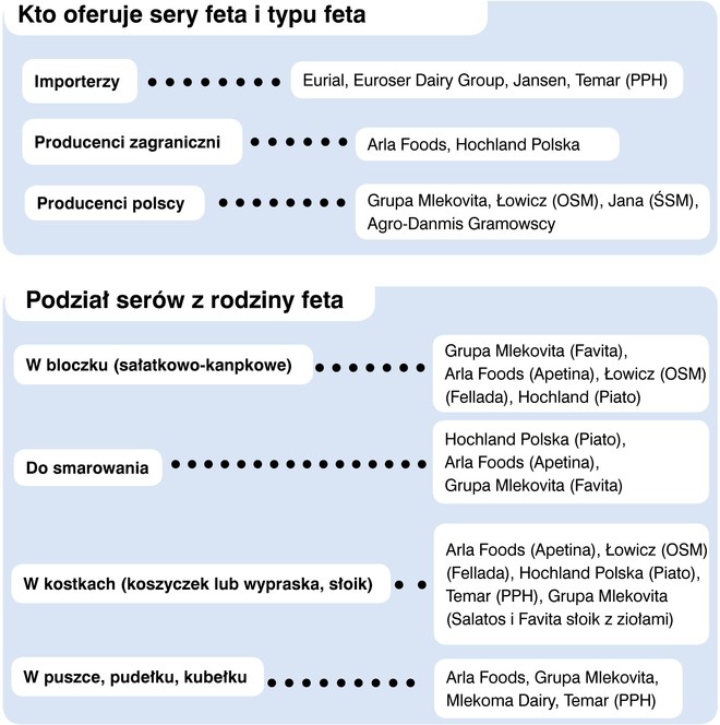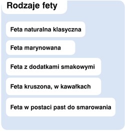 Feta stała się przysmakiem świata. Dlatego też oprócz wersji klasycznej na rynku występuje wiele jej wariantów. Można spotkać produkty marynowane, z dodatkami smakowymi oraz fetę kruszoną lub ciętą lub do smarowania.