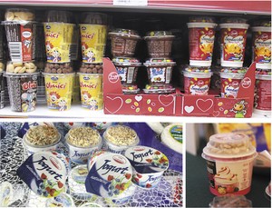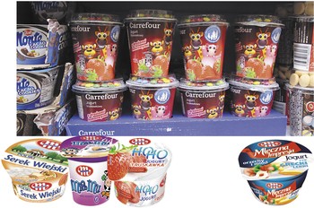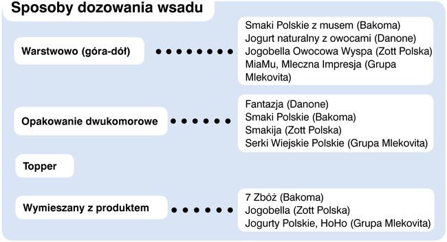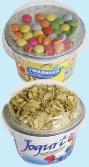 Danone w swojej ofercie na dwa typu produktów. jednym z nich jest jogurt z linii Activia Błonnik Plus oraz produkt dla dzieci Zakręcony mix z drażami. W ofercie mleczarni Czarnków (OSM) znajdziemy m.in. jogurt naturalny z płatkami śniadaniowymi (150 g jogurt + 20 g płatki). Z kolei czeska firma Olma w swojej ofercie posada m.in.: jogurt marki Florian Active naturalny z musli i owocami 150 g oraz jogurt Olmíci o smakach waniliowym i czekoladowym.