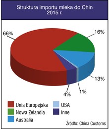 W 2015 roku import mleka do Chin wyniósł 460 tys. ton, a w prognozowanym imporcie w roku 2016 planowane jest na poziomie 650 tys. ton. Liderem importu mleka do Chin są kraje UE. Z naszego kontynentu do Chin jest importowane blisko 66% całego światowego importu mleka do tego kraju. Na drugim miejscu znajdują się Nowa Zelandia (16%), Australia (13%).
