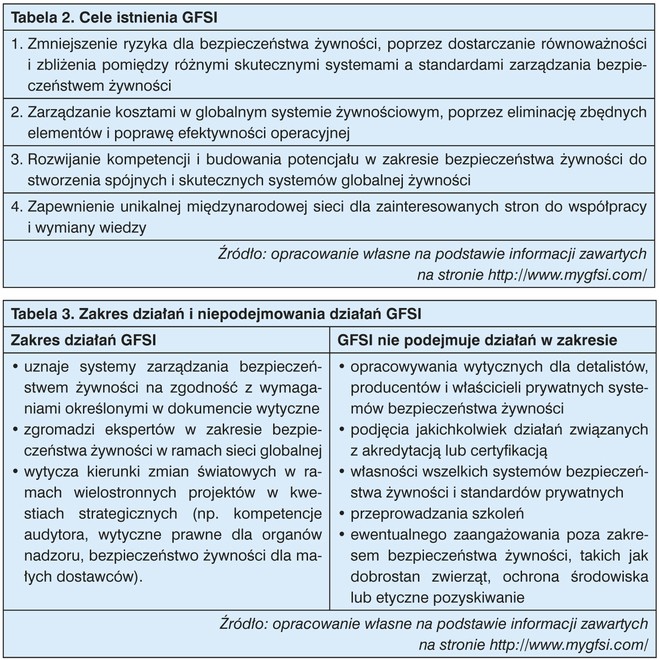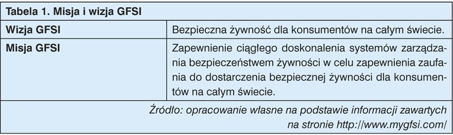 GFSI, to prywatna organizacja, założona i prowadzona przez międzynarodowe stowarzyszenie handlu. Głównym celem organizacji jest zapewnienie bezpieczeństwa poprzez wypracowanie i akceptowanie systemów bezpieczeństwa żywności na poziomie światowym, w całym łańcuchu dostaw. Członkami GFSI są najwięksi producenci żywności i detaliści. Współpraca odbywa się poprzez spotkania wiodących światowych ekspertów ds. bezpieczeństwa żywności sieci handlowych detalicznych, firm produkcyjnych i usługowych dla sektora produkcji żywności, a także organizacji międzynarodowych, rządów, środowisk akademickich i usługodawców dla globalnego przemysłu spożywczego. Na spotkaniach technicznych i konferencjach oraz imprezach regionalnych spotykają się ze sobą grupy robocze, w celu wymiany wiedzy i wspierania zharmonizowanego podejścia do zarządzania bezpieczeństwem żywności w całej branży. GFSI utrzymuje system porównania poszczególnych standardów bezpieczeństwa żywności dla producentów, jak również standardów dla produkcji pierwotnej (rolniczej) na farmach. Wizja i misja GFSI zostały przedstawione w tabeli 1.