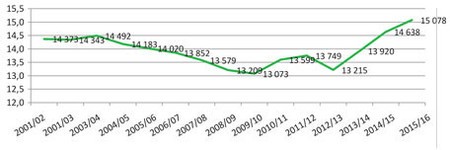 Całkowita produkcji mleka wynosi obecnie 15 078 mln litrów rocznie, co stanowi 5% wzrost na przestrzeni ostatnich 15 lat. Zauważana jest też pewna odbudowa liczebności bydła mlecznego, po gwałtownym spadku pogłowia w latach 2012-2013. Obecnie jest to 1906 mln sztuk. Systematycznie wzrasta także mleczność krów. Obecnie jest to 7912 litrów na rok (dla porównania 6449 litrów w 2001/02).