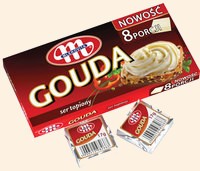 Niektórzy nabywcy chętnie widzą serki topione w roli samodzielnej przekąski do spożycia np. między głównymi posiłkami. W gusta tego typu konsumentów na pewno idealnie trafia ser topiony typu Gouda, w innowacyjnej formule: 17 g kostkach, idealnych do jednorazowego spożycia. Świeżość poszczególnych porcji zagwarantowano, stosując osobne pakowanie każdej z ośmiu kosteczek w kartoniku.