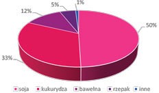 Wśród uprawianych gatunków dominują soja, kukurydza, bawełna i rzepak. Najwięcej uprawia się genetycznie modyfikowanej soi – 91,4 mln ha, co stanowi aż 50% całkowitego areału uprawy GMO na świecie i 78% całkowitego areału upraw tego gatunku na świecie. Kukurydza stanowi 33% globalnego areału GMO i 26% gatunku, bawełna: 12% areału GMO i 64% gatunku; rzepak: 5% z GMO i 24% areału uprawy całego gatunku. Pozostałe rośliny GM to tylko 1% całkowitego areału upraw GMO na świecie.