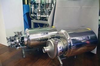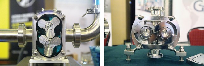 Kolejną nowością jest pompa dwuśrubowa Wangen model VarioTwin. Jest to pierwsza na świecie pompa dwuśrubowa z koszem i śrubą wstępną przeznaczona do delikatnego przepompowywania produktów, które same nie są w stanie napłynąć na pompę. Dobrym przykładem jest tu pompowanie twarogu. Pompa wyposażona jest w dwa niezależne napędy. Umożliwia to dokładne zgranie wydajności śruby podającej z wydajnością tłoczenia. Śruba podająca wykonana w formie wstęgi zabezpiecza pompę przed jej przeciążeniem, jednocześnie delikatnie napychając pompę na produkt, nie powoduje jego zniszczenia.