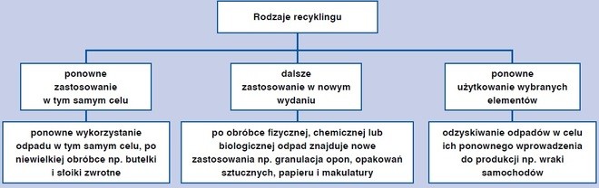 Jedną z form dbania o środowisko jest recykling. Jest to zaplanowany proces powtórnego wykorzystywania odpadów w celu wytworzenia nowego produktu. Celem tego procesu jest zmniejszenie nadmiernego eksploatowania złóż naturalnych oraz zmniejszenie ilości odpadów. Podstawową zasadą stosowaną w recyklingu jest maksymalne wykorzystanie dostępnych odpadów, przy jak najmniejszym nakładzie energetycznym i surowcowym.