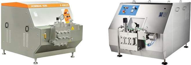 Drugim typem są homogenizatory ciśnieniowe, w których to pompy tłokowe przeciskają płynne produkty pod wysokim ciśnieniem (z przedziału od około 10 do około 70 MPa) przez wąską, wykalibrowaną szczelinę o szerokości około 0,3 mm, z dużą prędkością, nawet do kilku tysięcy metrów na sekundę. W przypadku stosowania tego typu urządzeń do mleka, umożliwiają one redukcję rozmiarów kuleczek tłuszczu poniżej 1 µm.